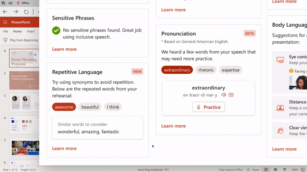 In addition to expanding the availability of Presenter Coach, we are also expanding the kinds of feedback this feature provides. Today, we are announcing three new critiques to Presenter Coach and bringing them to preview in PowerPoint for the web. These include feedback on body language, use of repetitive language, and pronunciation. These critiques are all described in detail below: